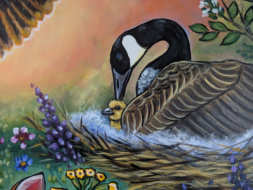 The Color of this direction is Yellow, with the element Fire. The medicine associated with this direction is Tobacco which is surrounding the baby fawn. The sacred animal depicted in this scene is the Eagle symbolizing love. Love embodies this scene with the baby Fawn, the mother Goose with her Gosling, the Eagle reaching up into the sky to touch the sun and awaken the world. This direction depicts the life stage of of Birth symbolizing new beginnings, sacrifice, nurturing, joy, and trust. The sun is depicted in this scene, which offers warmth, light and gives life to all creation.