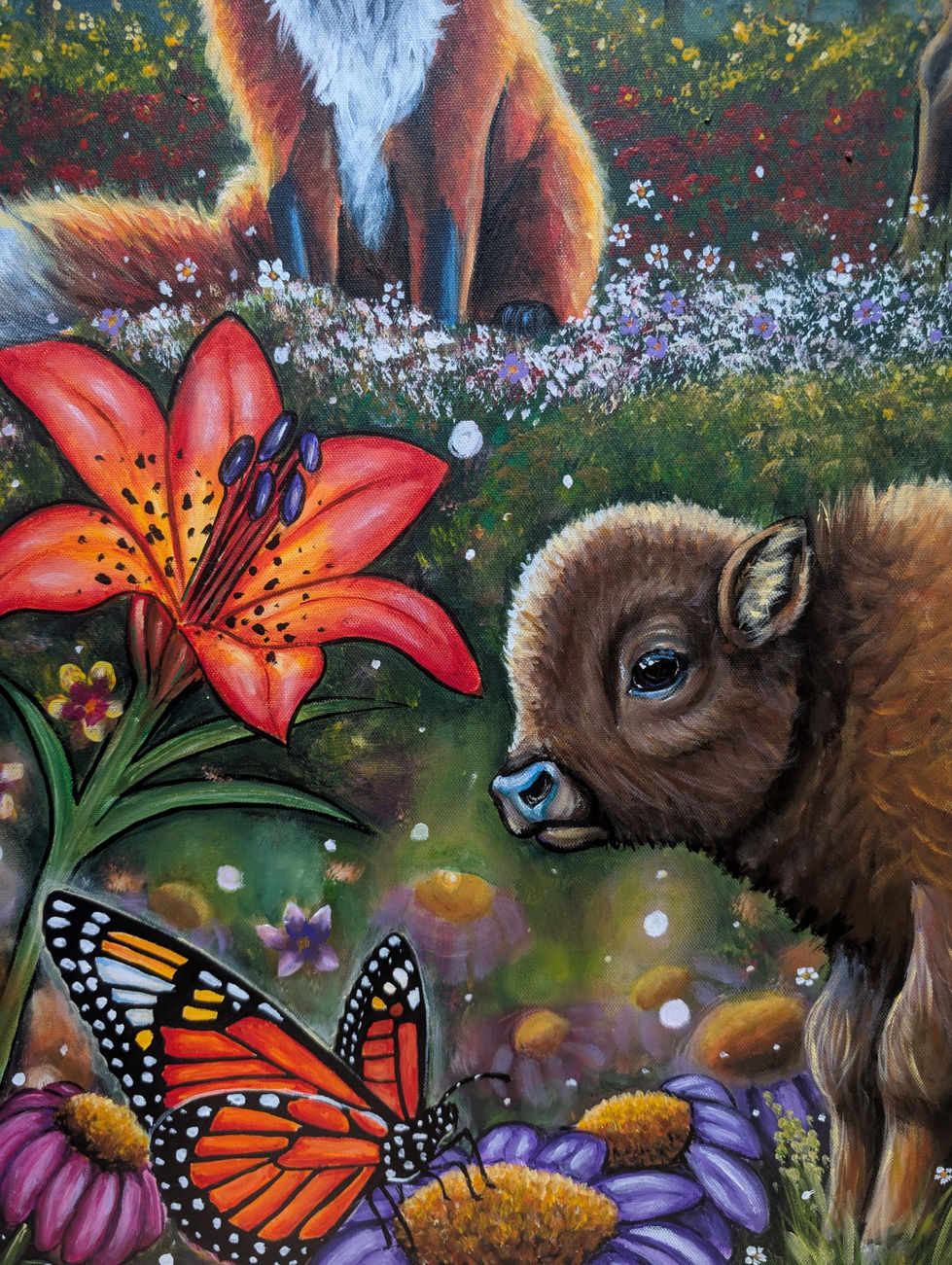 The Color of this direction is Red, with the element Earth. The medicine associated with this direction is Sweetgrass which the Buffalo are walking through and the Raven has in its claws. The sacred animals depicted in this scene are the Buffalo symbolizing respect for all life and people, the Raven and Sabe(bigfoot) symbolizing honesty. This direction depicts the life stage of Youth, a period of rapid growth and development, the mental aspect of focusing on learning and shaping the future.